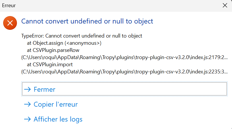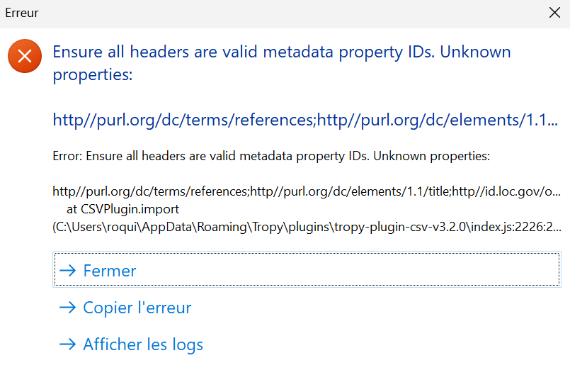 I am working with Tropy for a couple of years and I’ve changed my method and the way I create metadata for the Tropy objects I’ve created. I have around 5000 archive photos and I would like to harmonize the metadata for all of them without losing too much time. To do so, I’ve downloaded the CSV plugin. I’ve succeeded in exporting my project with the plugin. I’ve worked on the CSV file with Excel to harmonize the metadata for all the items on my project and to clean the spreadsheet. But, when I try to import the CSV back in Tropy, I have a error message.