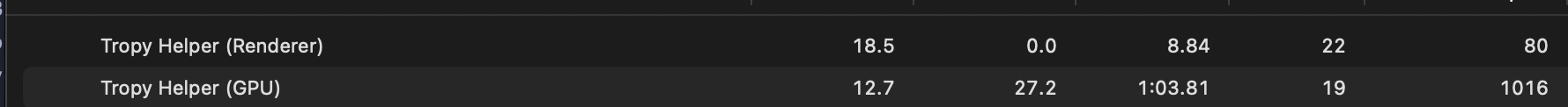 If I don’t move the mouse at all for about 1-2 seconds, the Tropy Helper (Renderer) thread load would return to almost 0